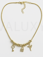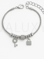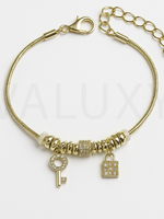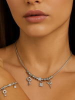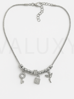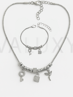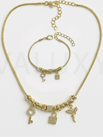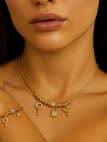 • Detalii: Set format din colier și brățară tip charm, decorate cu simboluri precum lacăt, cheiță, îngeraș și inele cu zirconii – fiecare element este gândit pentru a transmite protecție, iubire și libertate