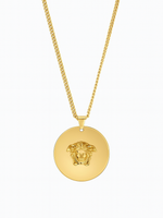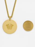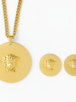 Detalii: Pandantiv si cercei rotunzi cu medalion Medusa în relief 3D, finisaj oglindă; lanț tip curb (double curb) cu aspect solid.