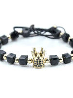 Bratara din onix si inox aurit, model coroana cu zirconii negre si margele patrate mari