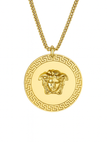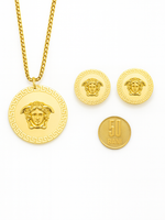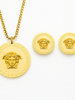 • Detalii: Pandantiv si cercei rotunzi cu medalion Medusa în relief 3D, finisaj oglindă; lanț tip curb (double curb) cu aspect solid.